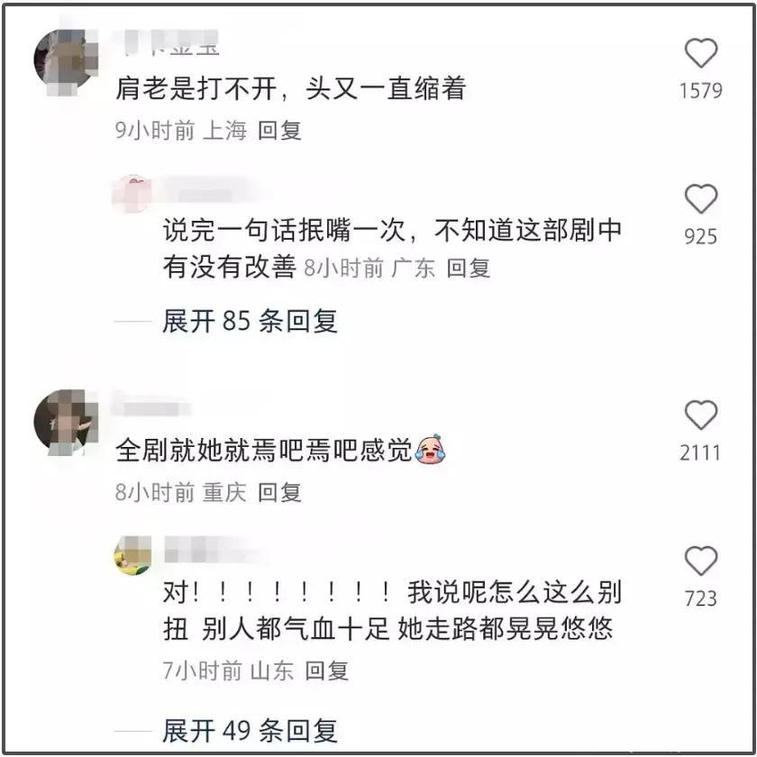 镜头不在自己身上就走神;哭戏模式化动不动就瘪嘴挤眼泪;体态一直没改善打不开肩挺不直腰。