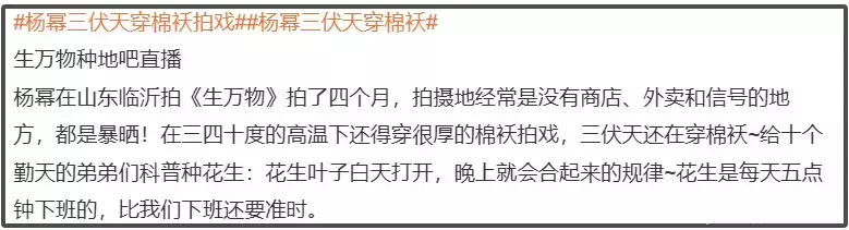 这时候总结杨幂为演好《生万物》所做的付出,就是在没有外卖和商店的农村,三四十度穿着棉袄,拍了三四个月戏,看到地里种的花生,了解了花生的习性,羡慕花生可以5点下班。